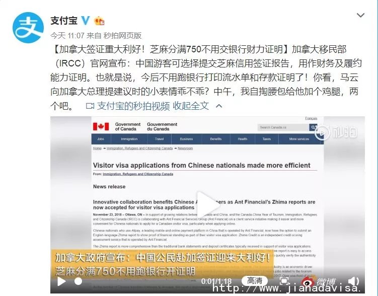 “11月26日,支付寶官方微博、芝麻信用官方微博接連發(fā)布消息稱:加拿大移民部(IRCC)官網(wǎng)宣布,中國游客可選擇提交芝麻信用簽證報告,用作財務(wù)及履約能力證明。也就是說,今后想去加拿大,辦簽證時需要的財務(wù)證明,只需登錄支付寶打開芝麻信用,在右下角點擊“信用管理”,再點擊芝麻簽證報告,就能看到加拿大,然后點擊立即申請,申請成功后下載到手機打印出報告,到時候跟其他簽證材料一起提交就可以啦!再也不用跑銀行打印流水單和存款證明,也不用拿房產(chǎn)證證明了!”